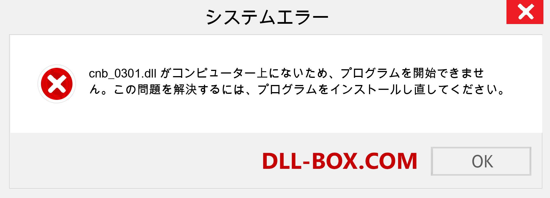 cnb_0301.dllに関連するエラーは、いくつかの異なる理由で発生する可能性があります。 たとえば、障害のあるアプリケーションcnb_0301.dllが削除または置き忘れられ、PCに存在する悪意のあるソフトウェアまたは破損したWindowsレジストリによって破損しています。