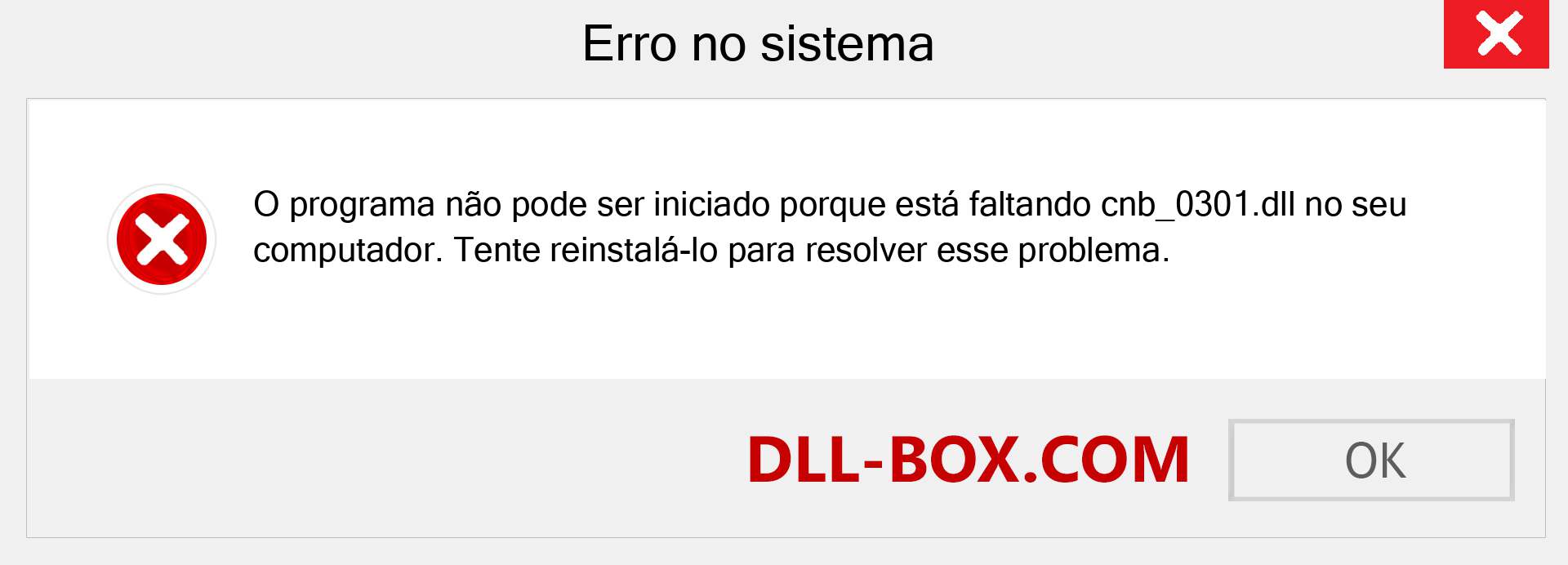 1. O programa não pode ser iniciado porque está faltando cnb_0301.dll do seu computador. Tente reinstalar o programa para resolver este problema.